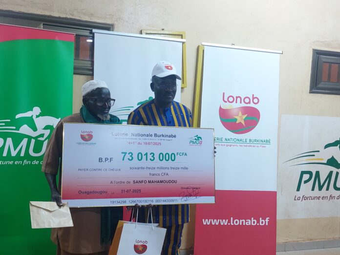 La Loterie Nationale Burkinabè (LONAB) a procédé, le Jeudi 31 Juillet 2025, à la remise d’un gros lot de 73 millions de F CFA au gagnant du 4+1 du PMU’B. Mahamoudou Sanfo a reçu son chèque géant des mains du directeur général de la LONAB.