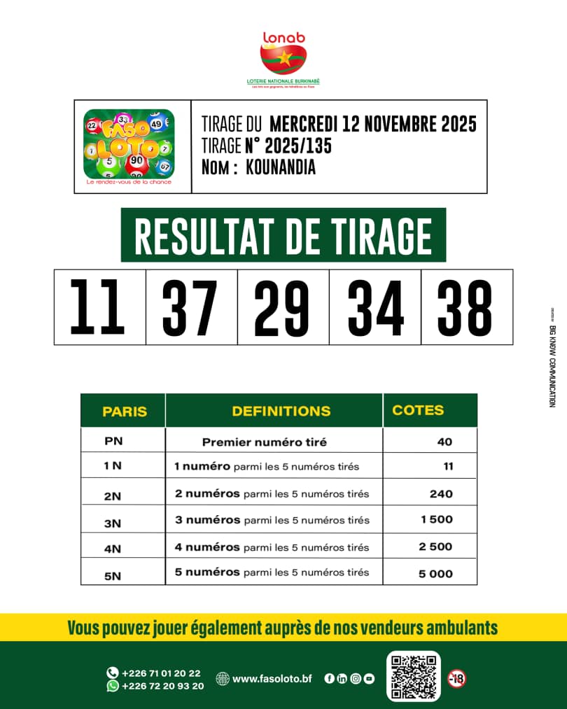 Faso Loto : Résultats du tirage du 12 novembre