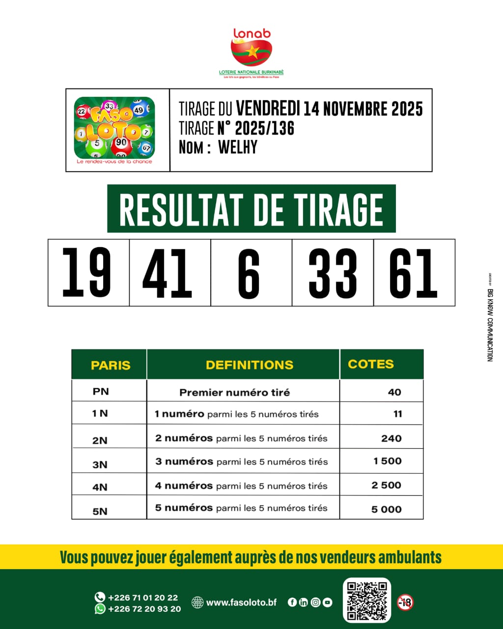 Faso Loto : Résultats du tirage du 14 novembre