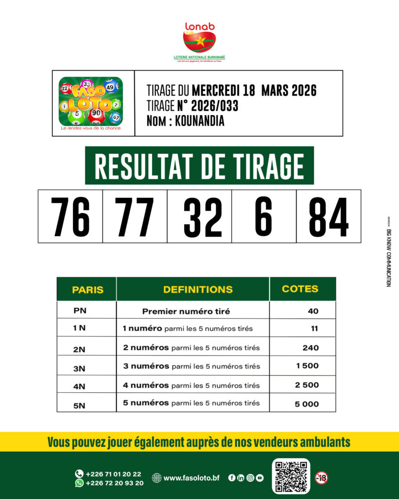MESSAGEFaso Loto : Résultats du tirage du 18 marsPar Le Reporter - mercredi, mars 18, 2026019FacebookXPinterestWhatsApp Logo de Faso LotoLa LONAB a procédé à la publication des résultats du tirage du loto n°2026/033 du mercredi 18 mars 2026.Nous vous proposons les résultats dudit tirage KOUNANDIA : 76-77-32-6-84