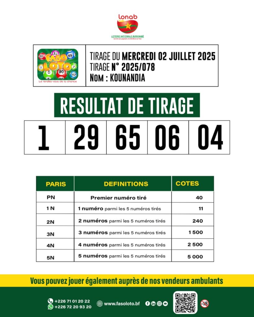 La LONAB a procédé à la publication des résultats du tirage du loto n°2025/078 du mercredi 2 juillet 2025.