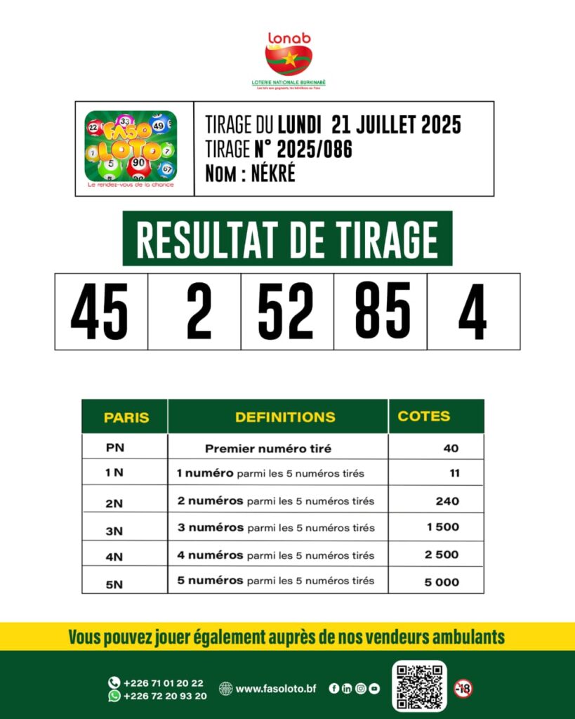 La LONAB a procédé à la publication des résultats du tirage du loto n°2025/086 du lundi 21 juillet 2025.