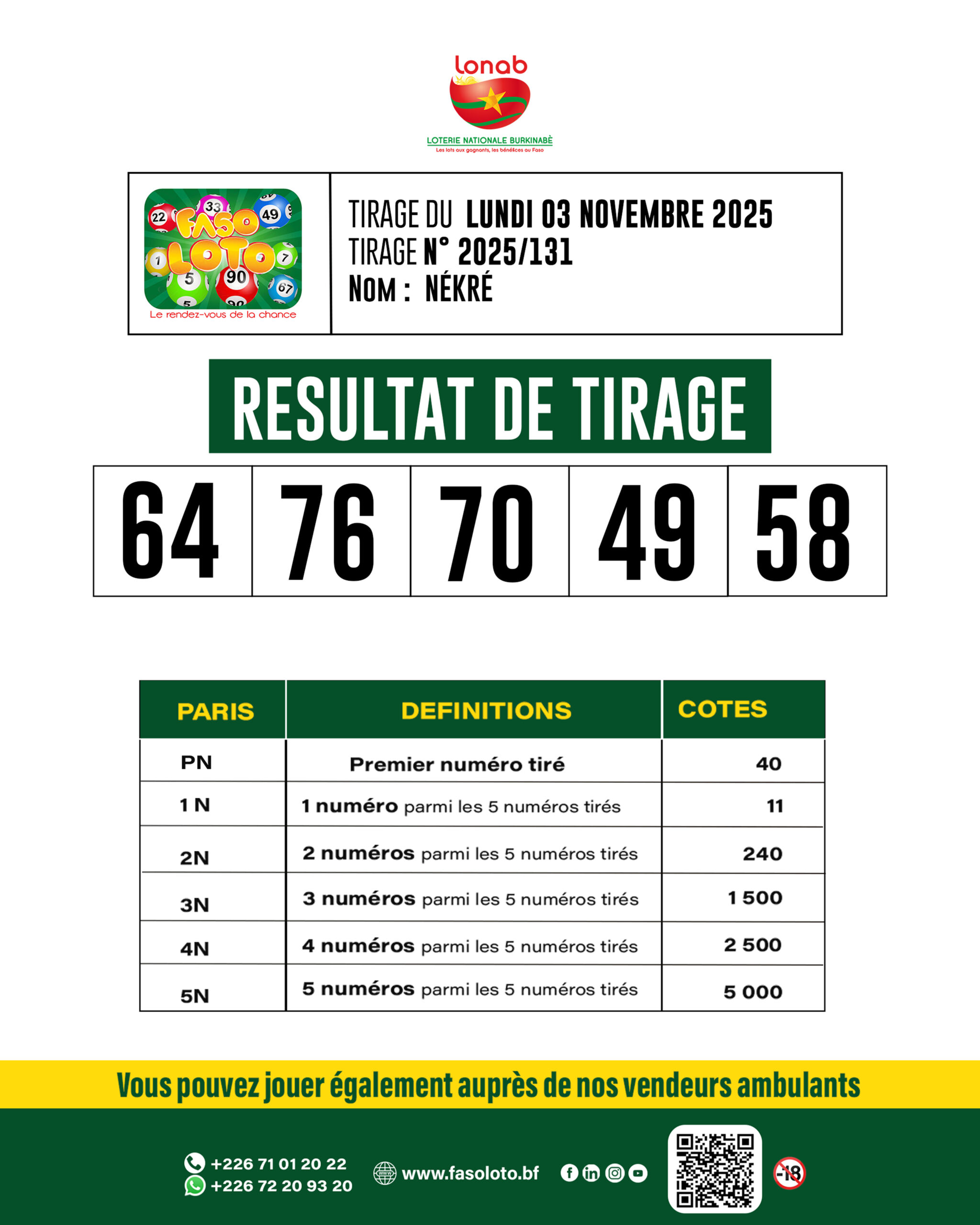 Faso Loto : Résultats du tirage du 3 novembre