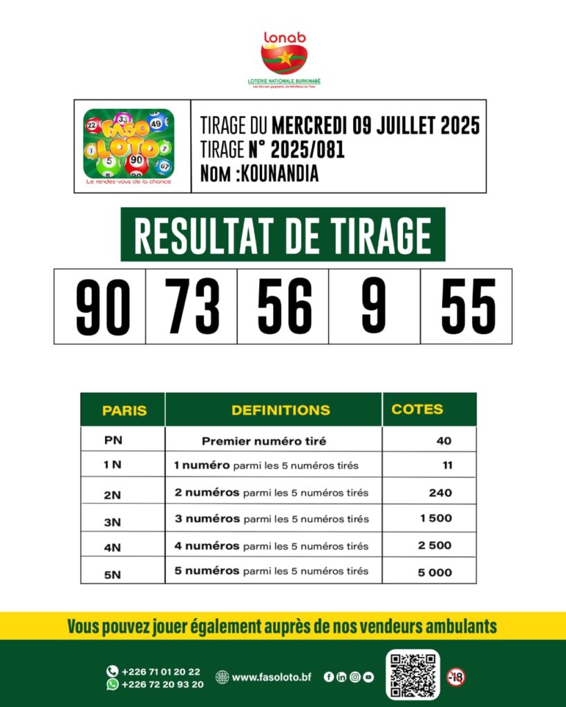 La LONAB a procédé à la publication des résultats du tirage du loto n°2025/081 du mercredi 9 juillet 2025.