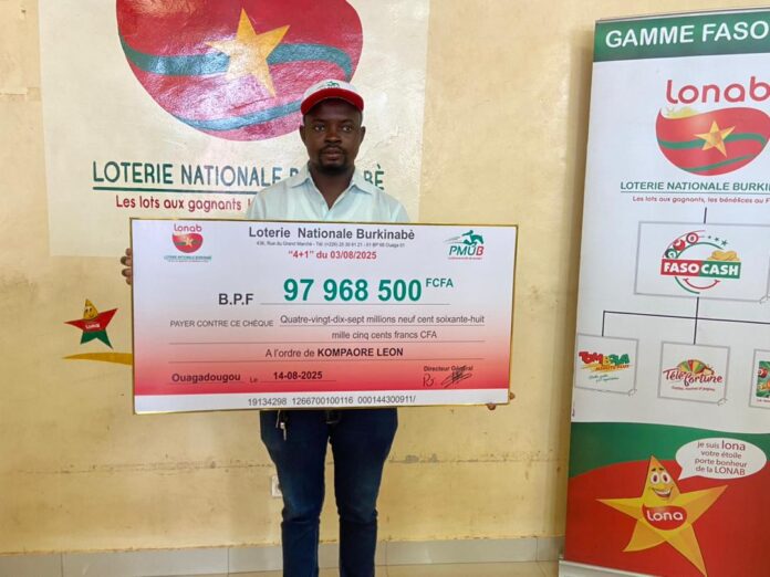 Le conseiller technique, représentant le directeur général de la Loterie nationale burkinabè (LONAB), Eugène Thiombiano, a procédé, ce 14 août 2025 à Ouagadougou, à la remise officielle d’un gros lot à l’heureux gagnant de 97.968.500 F CFA, Léon Kompaoré.