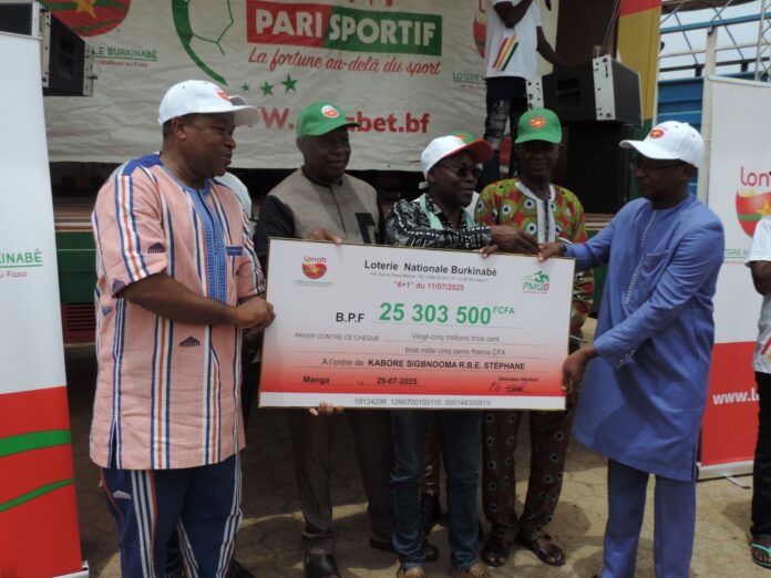 Les gains aux heureux gagnants et le bénéfice à la nation entière. Stéphane Kaboré fait désormais partie des heureux gagnants du PMU’B à Manga avec 25.303.500 F CFA pour avoir misé 9.900 FCFA le 11 juillet 2025. Ce mardi 29 juillet 2025, la LONAB a procédé à la remise de gros lot au du quinte 4+1 lors d’une cérémonie organisée à Manga. La cérémonie a été présidée par Mahamadi Dembèga, chef de service commercial à la direction régionale du Centre.