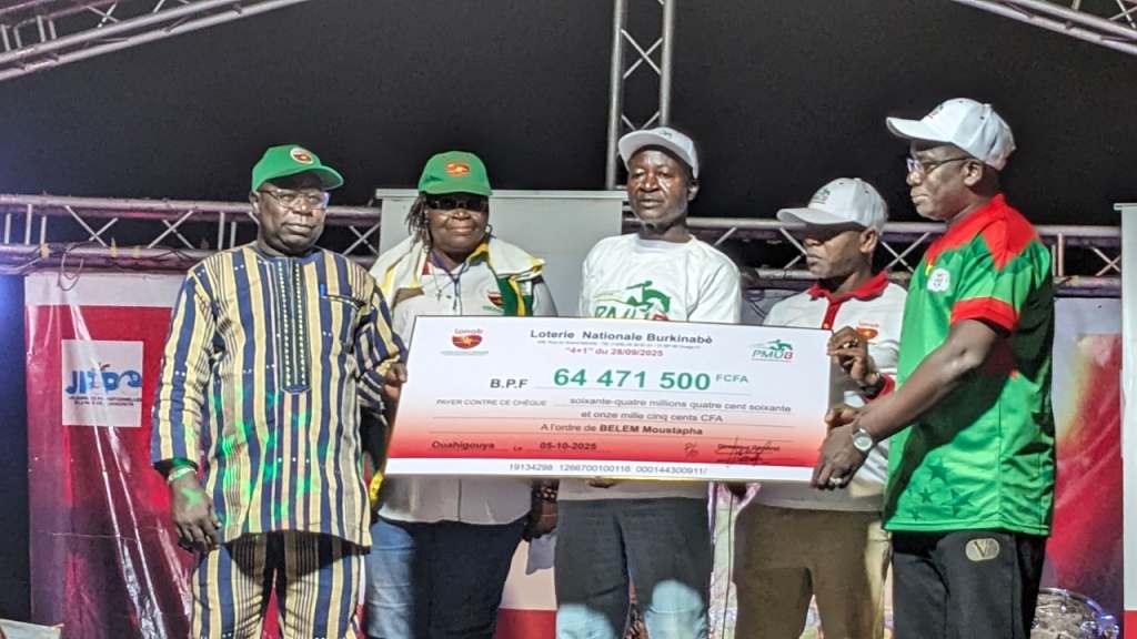 Au cours d’une cérémonie organisée par la LONAB sur le terrain d’entrainement de l’Union Sportive du Yatenga (USY) à Ouahigouya, Moustapha Belem, l’heureux gagnant du 4+1 du jeu Pari mutuel urbain Burkinabè du 28 septembre 2025 a reçu son chèque de plus de 64 millions FCFA des mains de Dieudonné Vebamba, conseiller technique du directeur général de la LONAB.